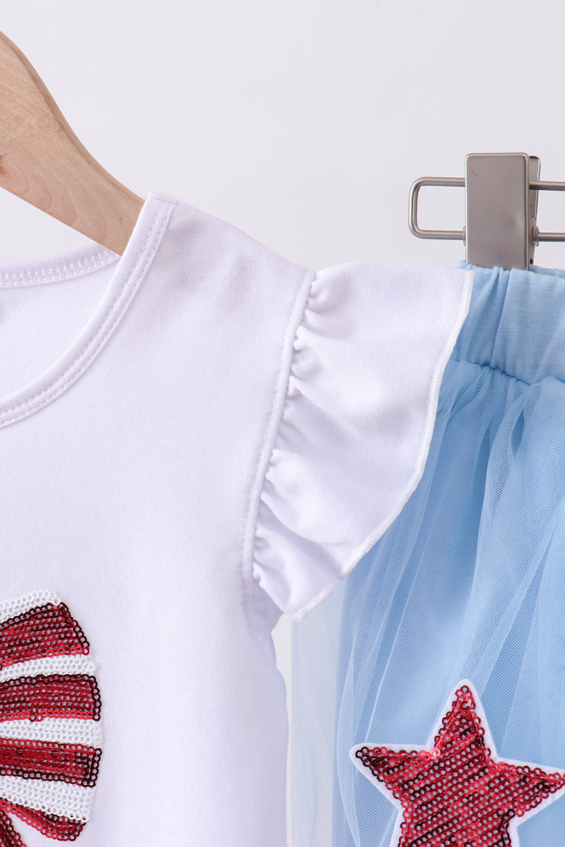 Elevate your wardrobe with this enchanting blue bow star sequin skort set. Featuring shimmering sequin detailing and a charming bow accent, this two-piece ensemble combines playful style with modern sophistication. The skort offers comfortable movement while maintaining a polished look, making it perfect for special occasions, parties, or standout everyday wear. The coordinated set ensures effortless styling—simply slip on and shine. Ideal for those who love bold, eye-catching pieces that make a statement.