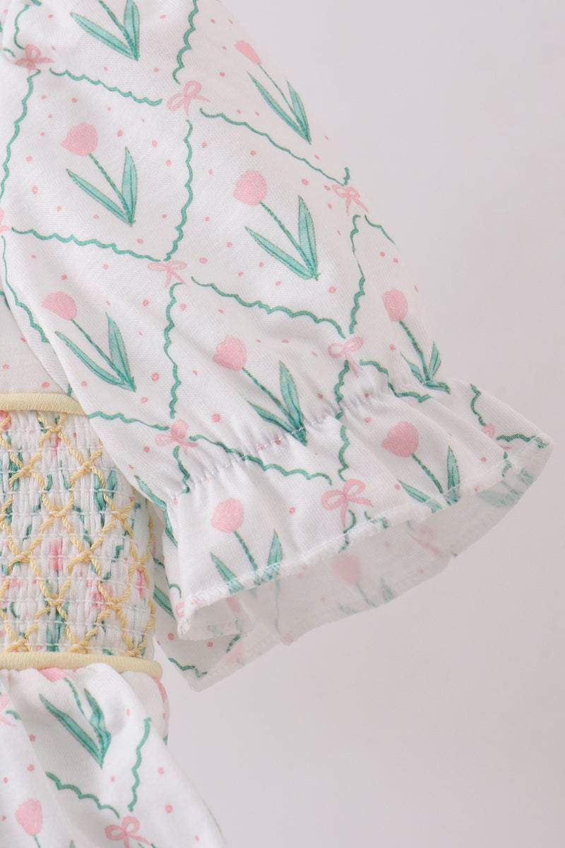 Hop into adorable style with this charming bunny bow smocked dress! Featuring delicate smocking details and a sweet bunny bow accent, this dress brings whimsical fun to any little one's wardrobe. The comfortable smocked bodice allows for easy movement and play, while the playful design makes getting dressed an exciting adventure. Perfect for playdates, celebrations, or everyday wear, this dress combines comfort with irresistible charm that kids will love.